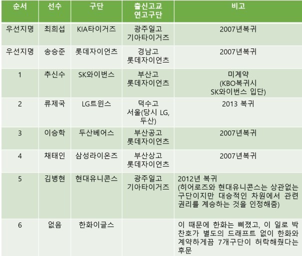 해외파 특별 드래프트는 2007년 4월에 시행되었는데 이는 재능 있는 선수들이 해외에서 돌아와 2년을 그냥 날리는 것을 방지하기 위해 실시한 드래프트로 연고지 내 선수가 많았던 기아와 롯데는 우선권을 갖고 나머지 영입 의사가 있는 구단들은 추첨으로 순서를 결정했다.